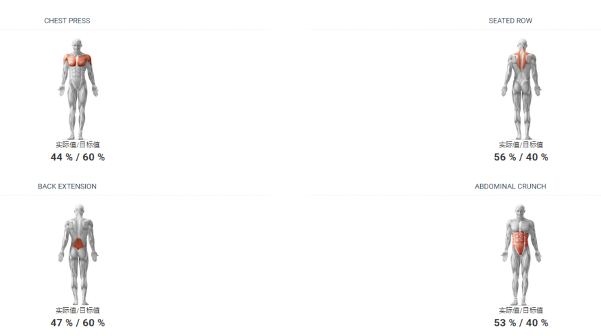 不仅如此,小A孩可以分肌肉群查看实际肌肉运动效果和目标的差距。也就是说可以通过数据对比,简单迅速地了解到底自己哪部分肌肉群比较优秀,哪部分比较薄弱。比如下图所示,可以随时查看自己的肌肉比例是否接近目标值。(图4)
